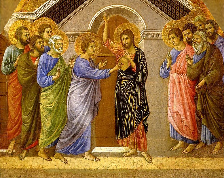 En ce temps-là, le soir de ce même jour, qui était le premier de la semaine, comme les portes du lieu où les disciples étaient assemblés étaient fermées, par crainte des Juifs, Jésus vint, et se tint au milieu d’eux, et leur dit : « La paix soit avec vous ! » Et après avoir dit cela, il leur montra ses mains et son côté. Les disciples se réjouirent donc, en voyant le Seigneur. Et il leur dit de nouveau : « La paix soit avec vous ! Comme mon Père m’a envoyé, moi aussi je vous envoie. » Ayant dit ces mots, il souffla sur eux, et leur dit : « Recevez l’Esprit-Saint. Les péchés seront remis à ceux auxquels vous les remettrez, et ils seront retenus à ceux auxquels vous les retiendrez. » Or Thomas, l’un des douze, appelé Didyme, n’était pas avec eux lorsque Jésus vint. Les autres disciples lui dirent donc : « Nous avons vu le Seigneur. » Mais il leur dit : « Si je ne vois dans ses mains le trou des clous, et si je ne mets mon doigt à la place des clous, et si je ne mets ma main dans son côté, je ne croirai point. » Huit jours après, les disciples étaient enfermés de nouveau, et Thomas avec eux. Jésus vint, les portes étant fermées, et il se tint au milieu d’eux et dit : « La paix soit avec vous ! » Ensuite il dit à Thomas : « Introduis ton doigt ici, et vois mes mains ; approche aussi ta main, et mets-la dans mon côté ; et ne sois pas incrédule, mais fidèle. » Thomas répondit, et lui dit : « Mon Seigneur et mon Dieu ! » Jésus lui dit : « Parce que tu m’as vu, Thomas, tu as cru. Heureux ceux qui n’ont pas vu, et qui ont cru ! » Jésus fit encore, en présence de ses disciples, beaucoup d’autres miracles, qui ne sont point écrits dans ce livre. Ceux-ci ont été écrits, afin que vous croyiez que Jésus est le Christ, le Fils de Dieu, et que, le croyant, vous ayez la vie en son nom.